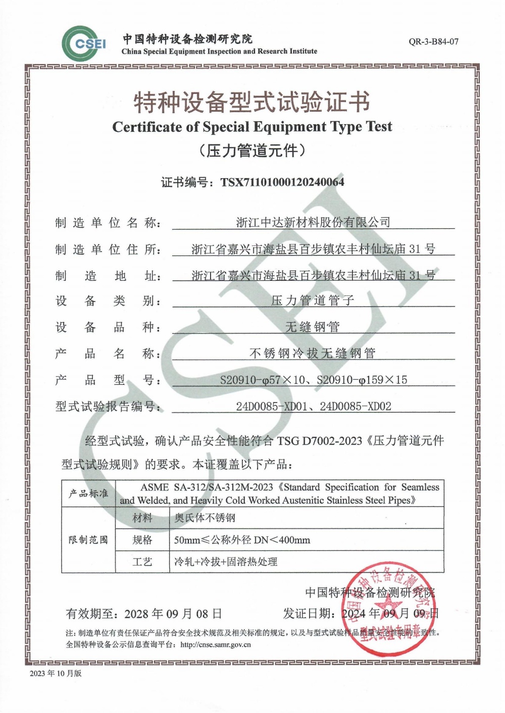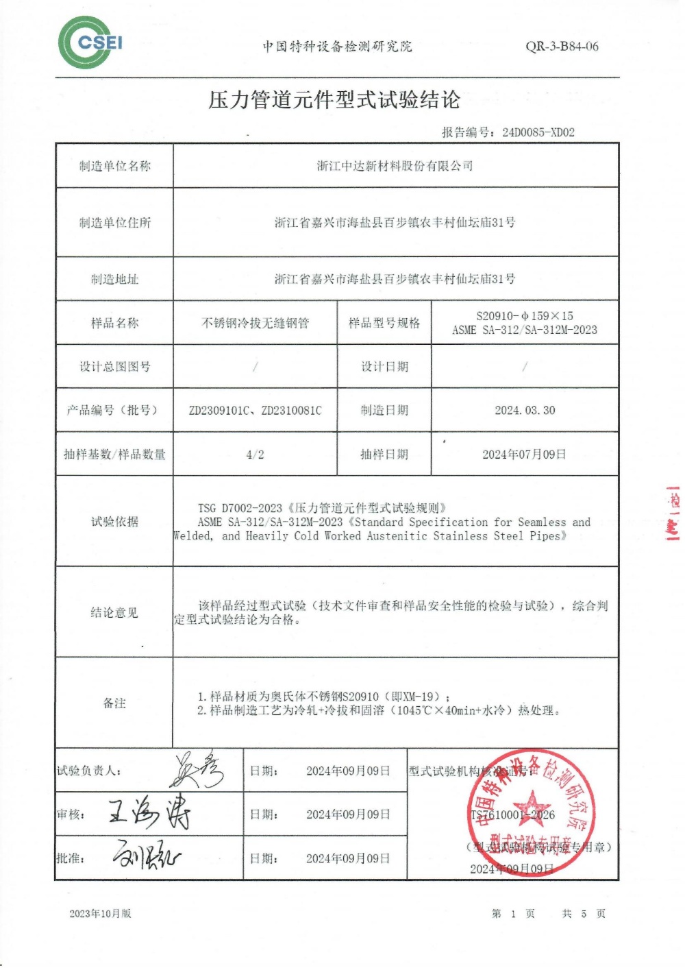 中達新材在不銹鋼冷軋(拔)無縫鋼管產品的質量管控與校驗,生產過程控制中等各方面,均符合產品的相關標準,在保證用戶實際需求的同時,確保產品質量穩定可靠,為用戶降低成本,提高可持續收益。此次成功獲取特種設備型式試驗證書是中達新材質量為本、規范發展之路上又一個重要里程碑。