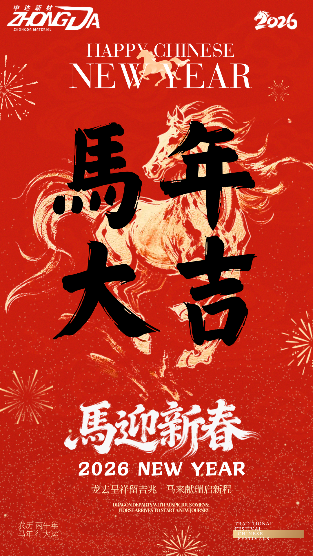新材給您拜年啦 2026-02-16 08:22:53 浙江中達新材料股份有限公司 瀏覽次數 5 辭舊迎新,福暖新春。中達新材感謝大家過去一年的辛勤付出與鼎力支持!馬年伊始,祝愿大家身體安康,財源廣進,事業如駿馬奔騰,蒸蒸日上! 上一條致敬!春節里的“中達堅守者” 下一條歲末送暖 慰訪三家 —— 中達新材工會走訪困難職工家庭